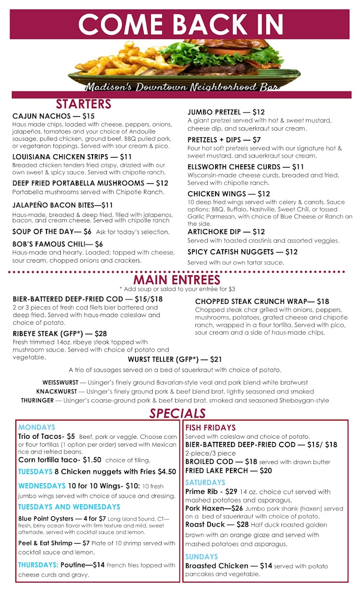 Beyond the food, the atmosphere captivates with its character and casual vibe, making it an ideal spot to gather with friends. Guests appreciate the attentive service, which balances friendliness with privacy. Don't miss the exciting weekly specials, including the popular jalapeƱo bacon bites and Monday taco deals that add a twist to your experience. At Come Back In, it's not just a meal; it's an invitation to return for more delightful flavors.